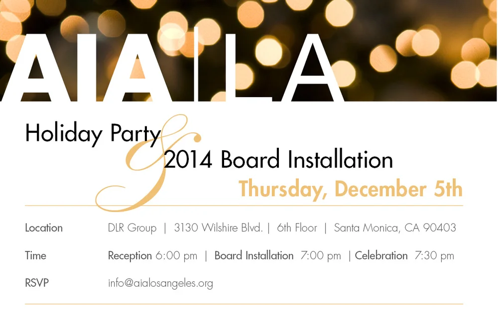 You are invited to the AIA Los Angeles Holiday Party and 2014 Board Installation at DLR Group. Come join AIA|LA as we welcome our new board and celebrate the holidays with our members!